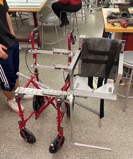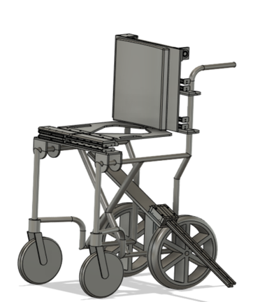 Solution: My team (Silver) designed and manufactured Aisle Assist, a compact aisle wheelchair that eliminates the uncomfortable lifting of paraplegic flyers from their wheelchairs to their airplane seat. It takes advantage of removable, height adjustable seat panels and a backrest attached to linear rails, to gently slide and deposit users onto their aisle seat.