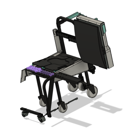 The chair works by lifting the wheelchair seat above the plane seat, sliding the user over, and retracting the backrest and seat panels once the user is comfortable. Linear rails and carriages enable the sliding action while the seat panels are raised with a winch situated behind the seat. With a 10:1 gear ratio and non-back drivable winch, the lifting mechanism is safe and requires 10 pounds of force from the flight attendant. The design was also included a deployable stabilization leg to prevent the chair from tipping during the transfer process.
