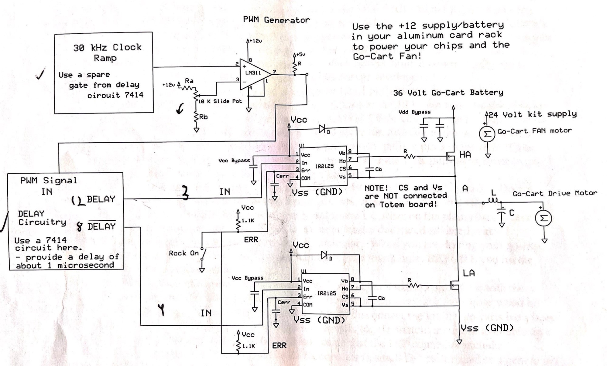 Wired a Buck Converter Drive for Go Cart DC Drive Motor. The MOSFET Drivers are run on 30 kHz alternating delay signals. An LC low pass filter, smoothed the input to Go Cart Motor.